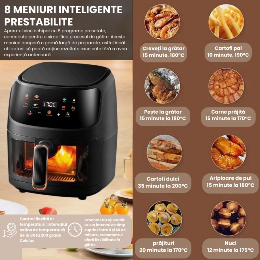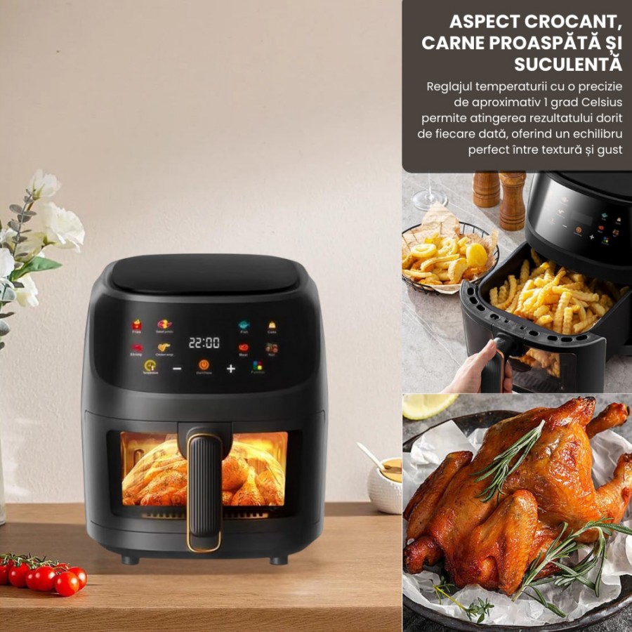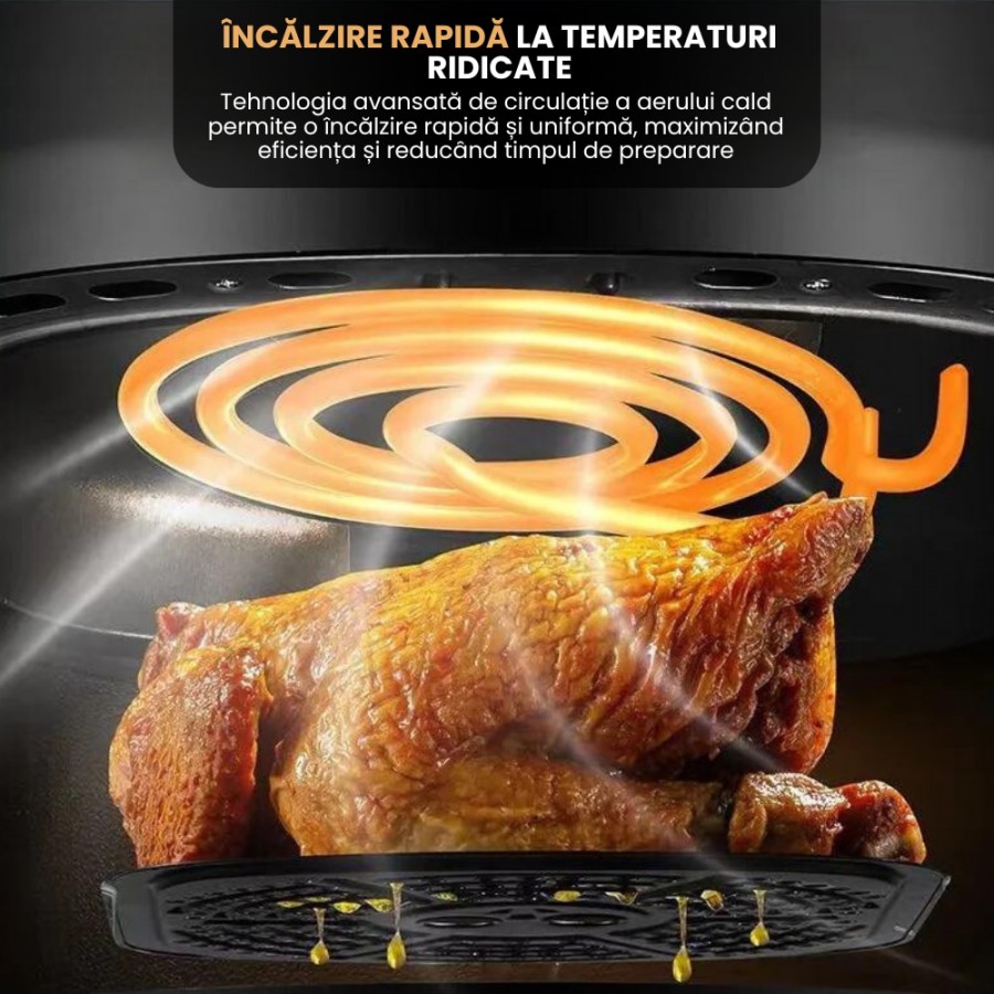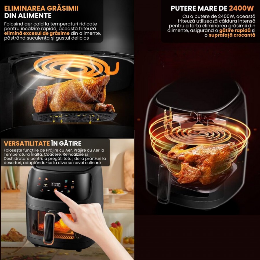 - Funcții multiple: prăjire cu aer cald, coacere, grill, reîncălzire și uscare.