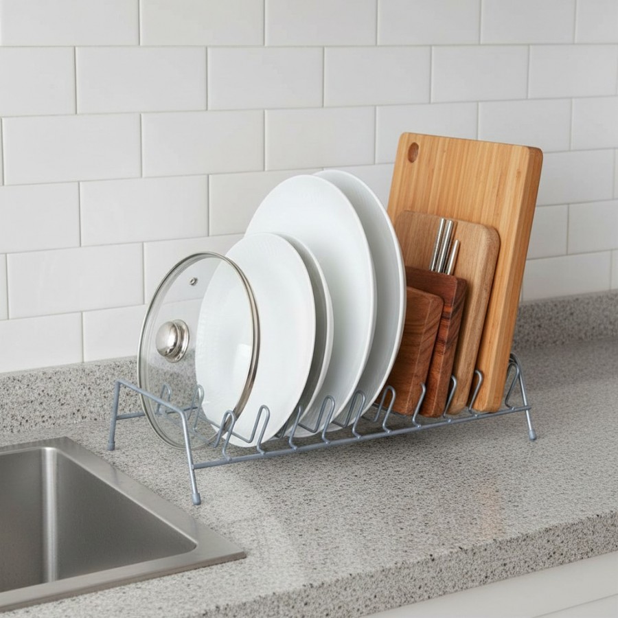 Solutie eficienta pentru organizarea farfuriilor, capacelor si tocatoarelor in bucatarie.