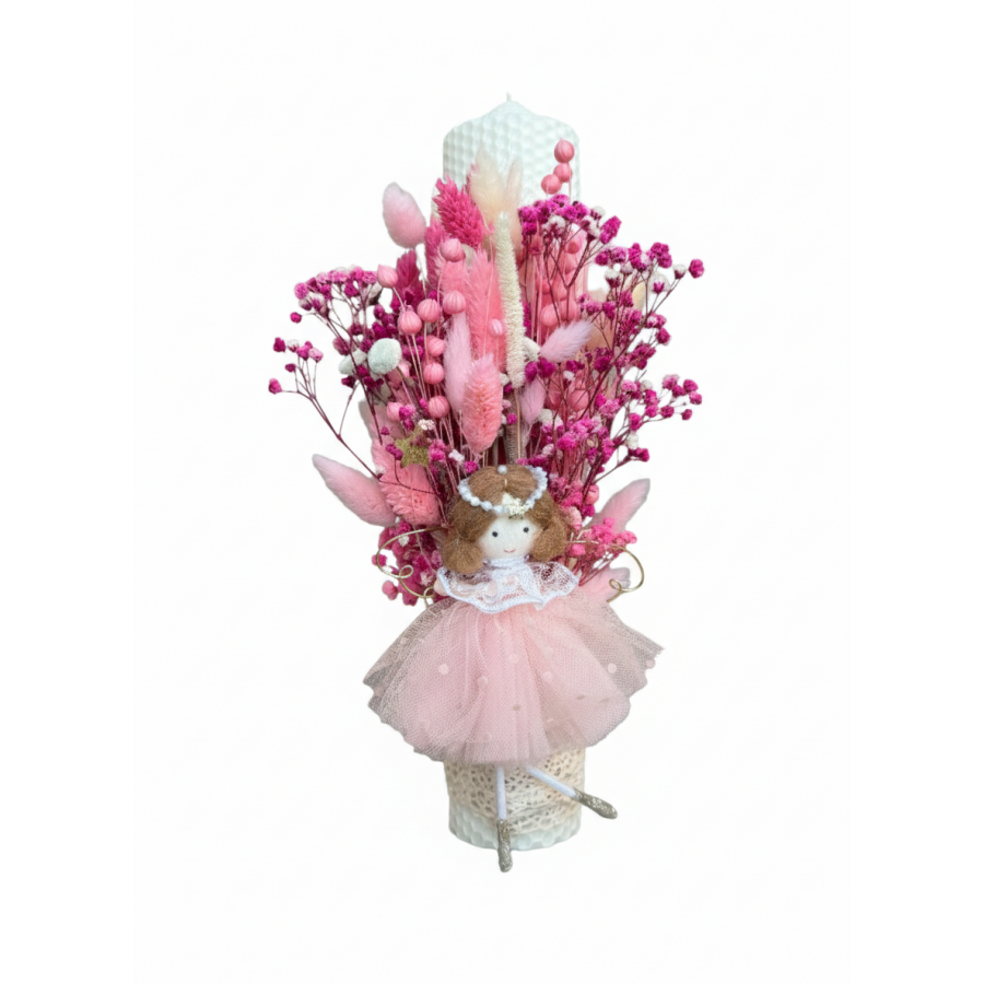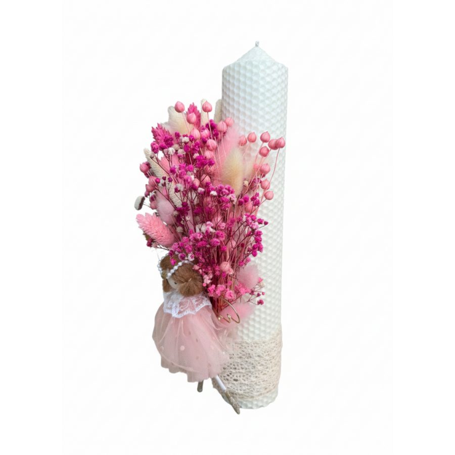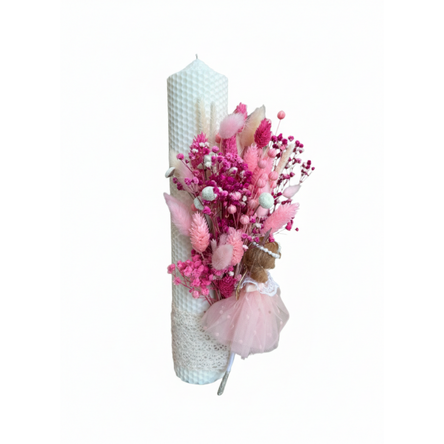Lumânare de botez din ceară naturală – culoare milky white, decorată cu flori uscate și zână îngeraș