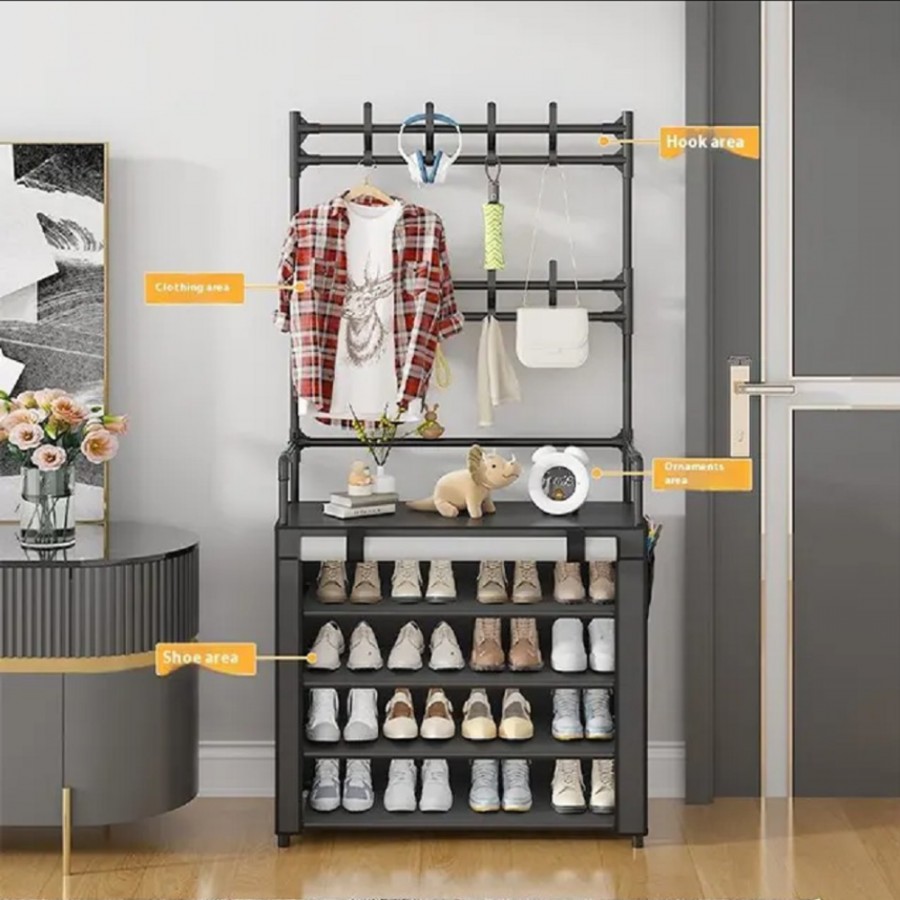 - Sistem 2-in-1: Unitatea combina un cuier practic pentru haine (paltoane, jachete) cu un organizator eficient pentru incaltaminte.