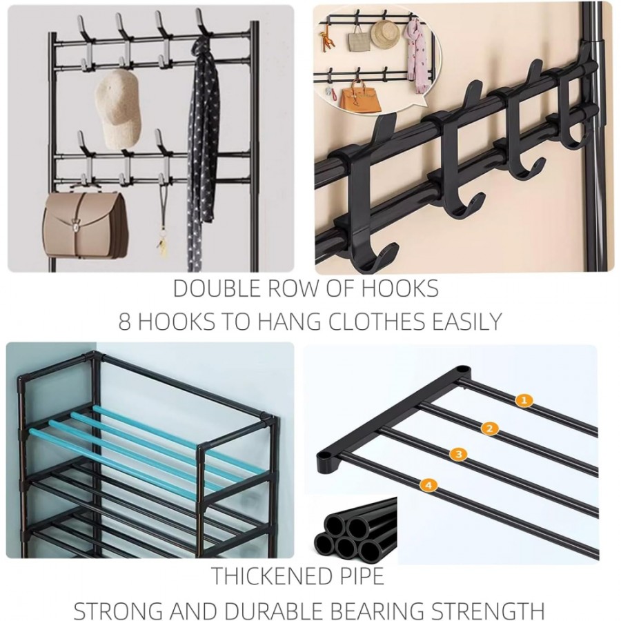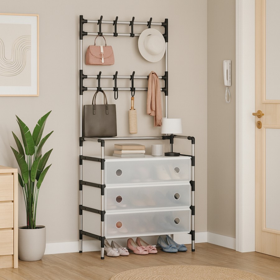 Maximizeaza spatiul de depozitare in hol sau dressing cu acest Dulap Organizator Multifunctional, ideal pentru incaltaminte si accesorii. Dispune de 5 polite spatioase, usi frontale si carlige laterale, toate sustinute de un cadru metalic stabil.