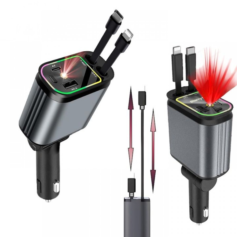 Incarcator Auto 4 in 1 Ultra-Rapid 66W, Cabluri Retractabile, Afisaj Digital, Negru