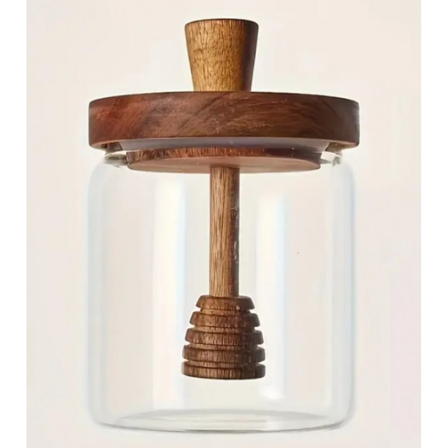 Designul transparent permite vizualizarea continutului, iar capacul din lemn ofera un aspect natural si protejeaza mierea impotriva impuritatilor.