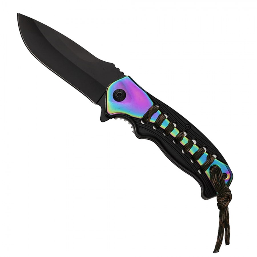 Manerul ergonomic de culoarea curcubeului este realizat dintr-o combinatie de otel, plastic si are un multifunctionalitate un snur paracord.