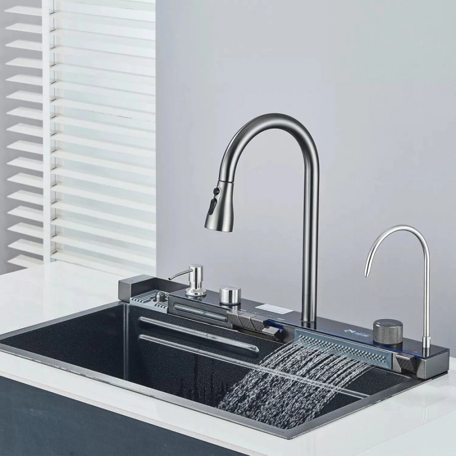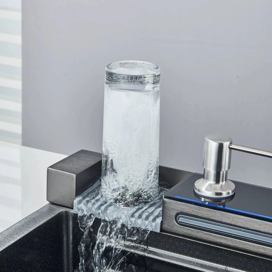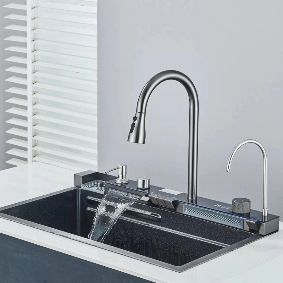 Transforma-ti bucataria intr-un spatiu modern si functional cu aceasta chiuveta multifunctionala premium. Echipata cu 2 cascade inovatoare, un afisaj digital precis al temperaturii si un robinet tip cascada elegant, aceasta chiuveta din otel inoxidabil de inalta calitate cu finisaj negru grafit adauga un plus de stil si eficienta oricarei bucatarii.