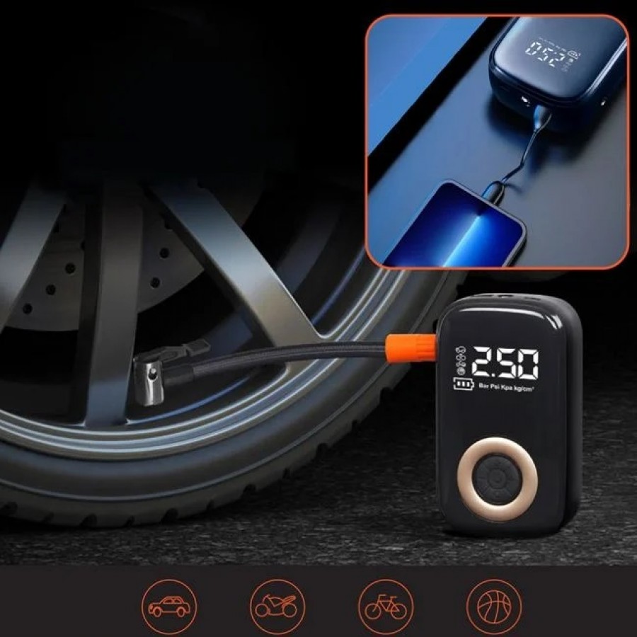 Pompa electrica portabila 5V/1A ideala pentru umflarea anvelopelor. Cu inca 2 functii precum lanterna cu lumina de avertizare si functie SOS si ca power bank cu acumulator litiu reincarcabil. Timp de functionare: aprox. 12 minute. Capacitatea bateriei 1500mAh si presiunea de umflare 150PSI. Functioneaza cu cablu USB. Este ideala pentru utilizarea pe timp de noapte si in situatii de urgenta. Pentru masini, motociclete, biciclete sau mingi.