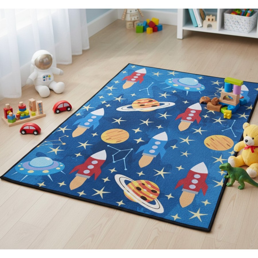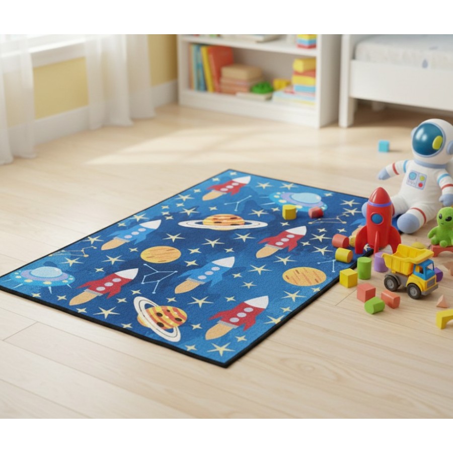 Aduce un strop de culoare si imaginatie in orice incapere, fiind perfect pentru camera copiilor sau un spatiu de joaca creativ. Cu un design atractiv ce include planete si rachete, stimuleaza curiozitatea si dorinta de explorare a celor mici. Este realizat din material moale si placut la atingere, oferind confort si protectie pentru podea.