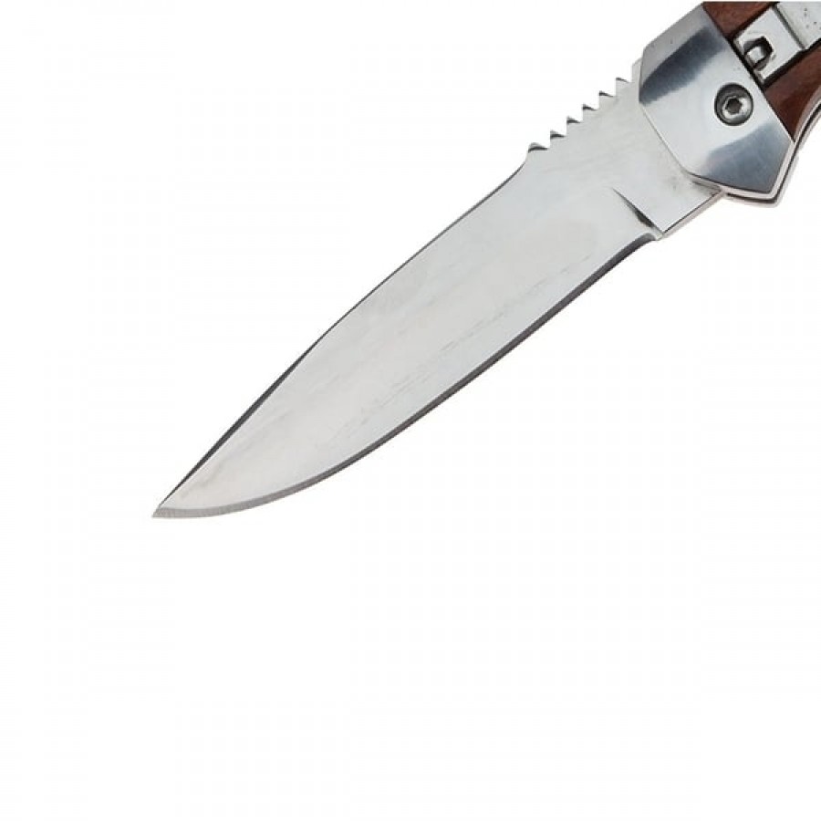 Manerul este realizat din metal cu insertii din lemn, oferind o prindere ergonomica si sigura. Este prevazut cu un orificiu pentru snur si un sistem de blocare automat, care previne inchiderea accidentala a lamei.