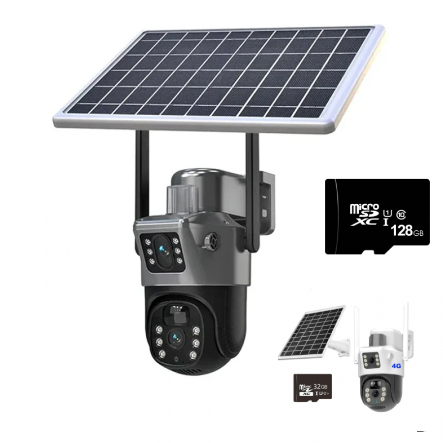 Cameră de Supraveghere cu panou solar si 4g cu 2 obiective 6MP și Vedere Nocturnă. Card microSD 128Gb si adaptor inclus.