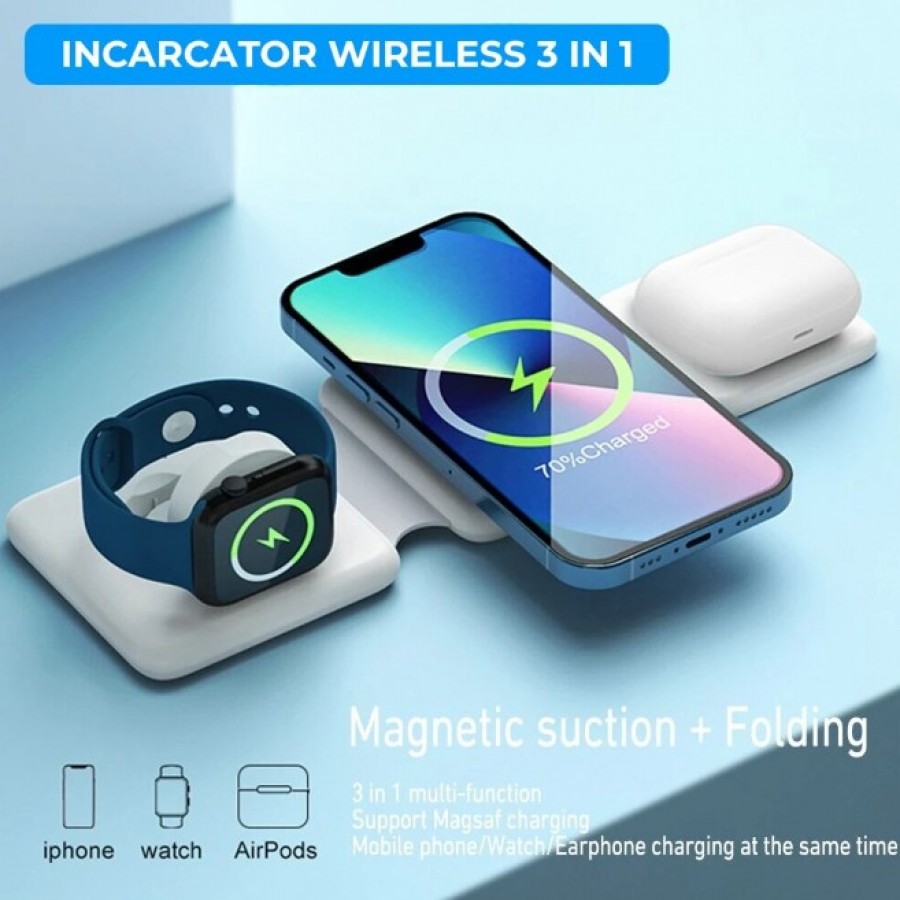 Incarcator Wireless 3 in 1 MagSafe Portabil, Statie Incarcare Qi Fast Charge 15W