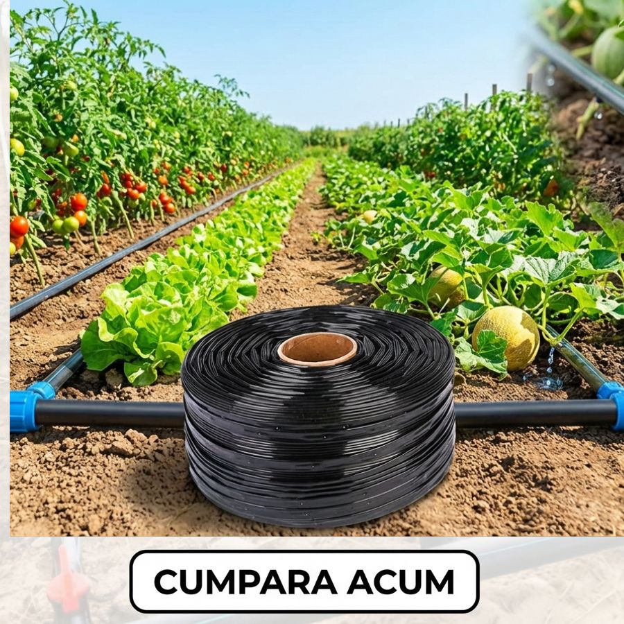 - Banda de picurare cu diametru de 16 mm, rola de 100m, distanta intre picuratori de 30 cm, 2.2 L/h