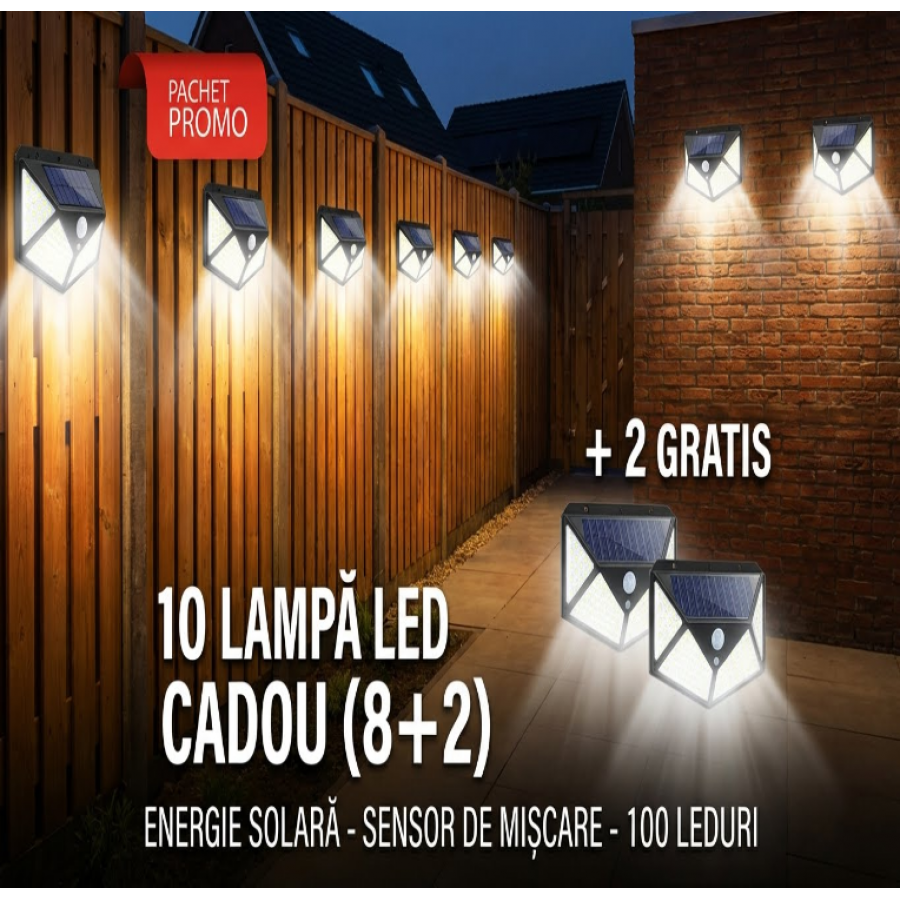 PACHET PROMO 8 + 2 CADOU Lampă solară 100 LED cu senzor de mișcare – LUMINĂ PUTERNICĂ, FĂRĂ COSTURI!