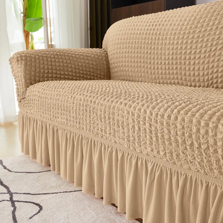 Etichete: Husa creponata universala canapea 3 locuri, bej-cafea cu lapte, cu volane, bumbac, rezistenta la apa, Textile si Covoare, Articole pentru casa