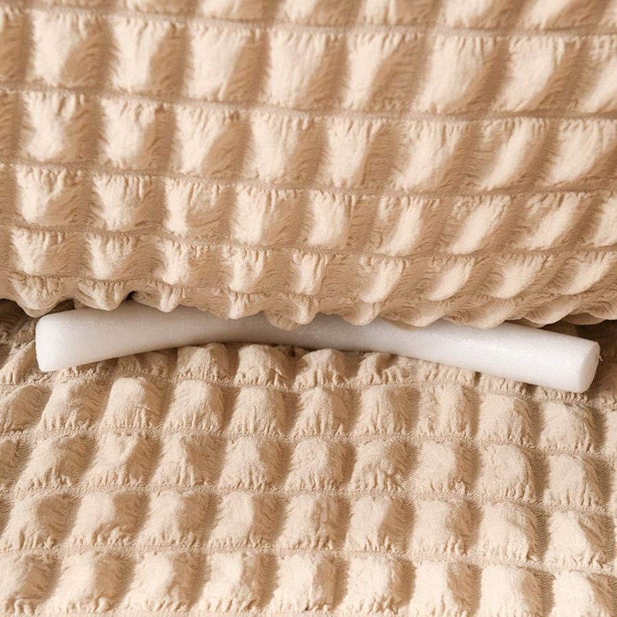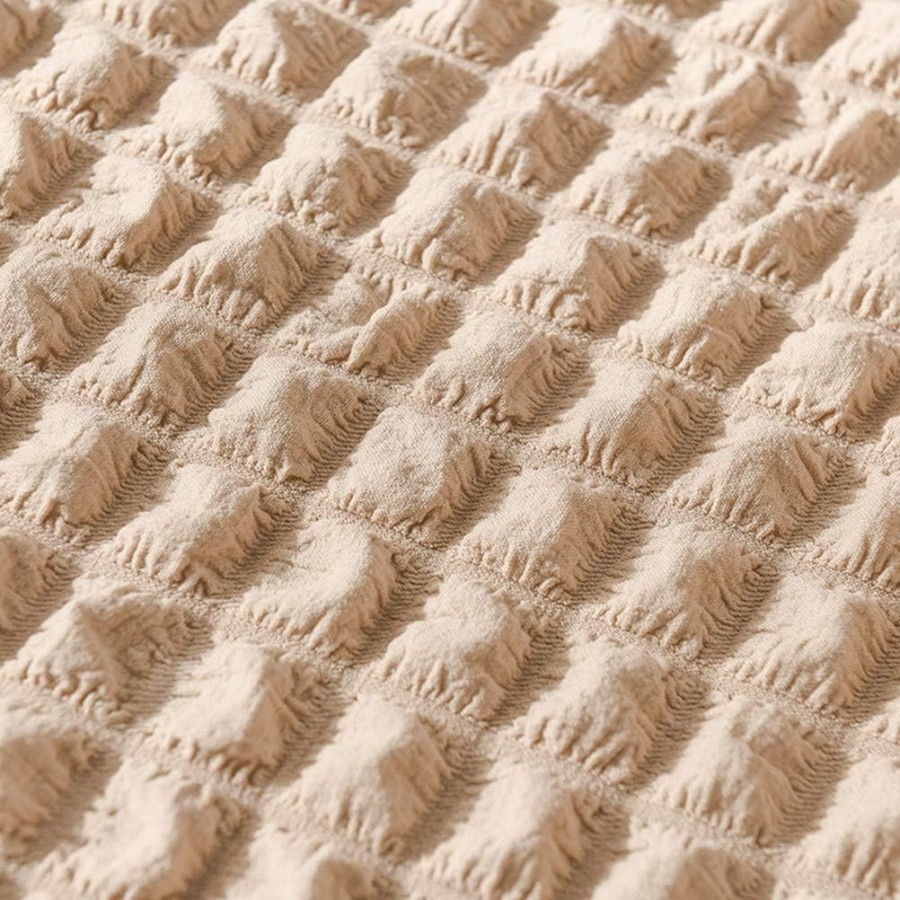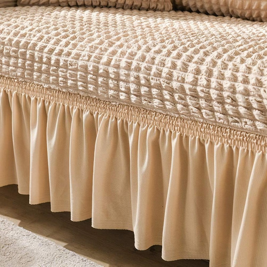 Husa creponata universala canapea 3 locuri, bej, cu volane, bumbac, rezistenta la apa