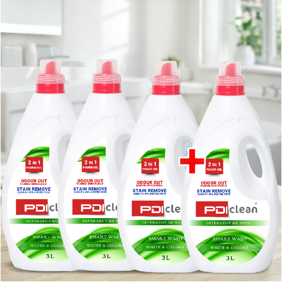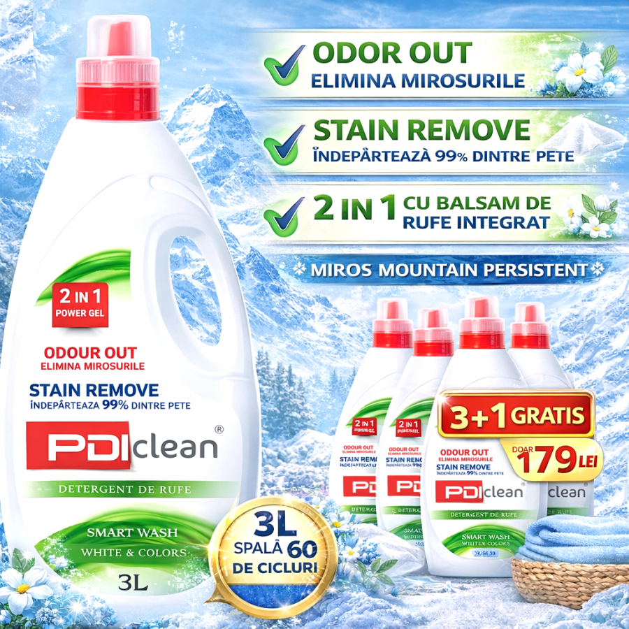 3+1 Gratis Detergent de rufe 3L Mountain, un nou pachet promotional economic.