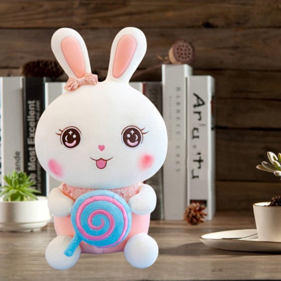 Descopera acest iepuras adorabil, moale si pufos, conceput pentru a fi prietenul perfect al celor mici. Acest mic companion fermecator tine in brate o bombonica colorata si stralucitoare, aducand o explozie de veselie in orice incapere.