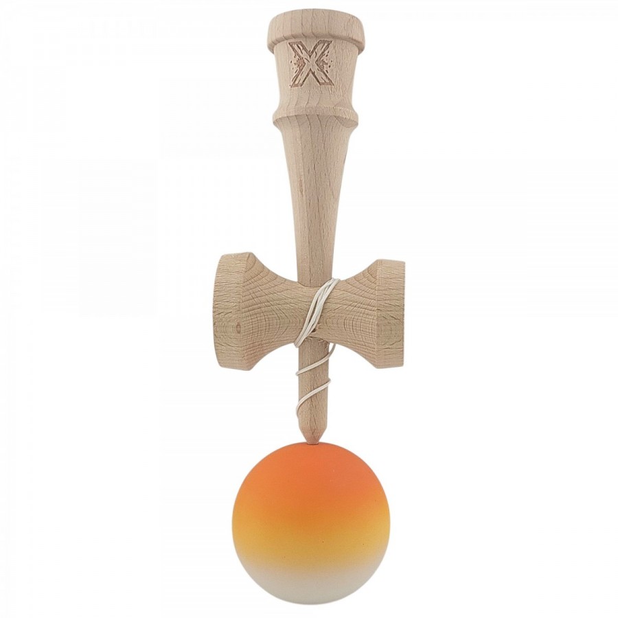 Kendama X Originala, Kendama Profesionala din Lemn, Rubber Grip, 18 cm, Portocaliu/Galben/Alb