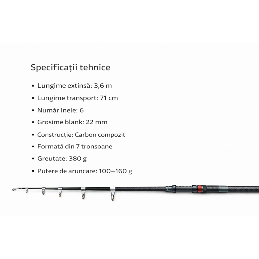 Lansetă Telescopică 3,6 m Carbon Composit, 100–160 g, 7 Tronsoane, 6 Inele, 380 g, Transport 71 cm