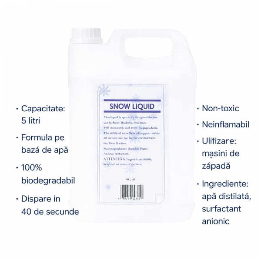 Lichid special conceput pentru utilizare cu masini de zapada artificiala, ideal pentru evenimente, decoruri festive, petreceri tematice sau productii artistice. Formula pe baza de apa, non-toxica, neinflamabila si complet biodegradabila, asigura o experienta sigura si ecologica.