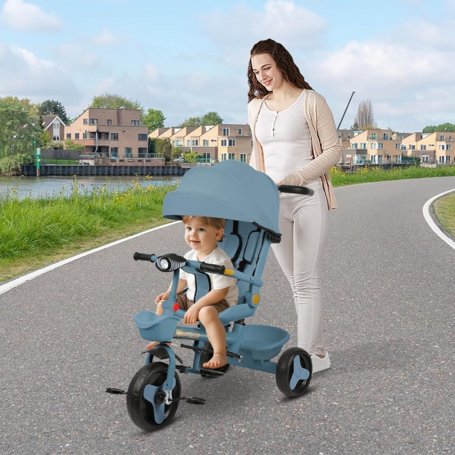 Tricicleta copii 4 in 1 cu maner parental, Stil carucior, Scaun pliabil pe spate, Albastra, 1-5 ani