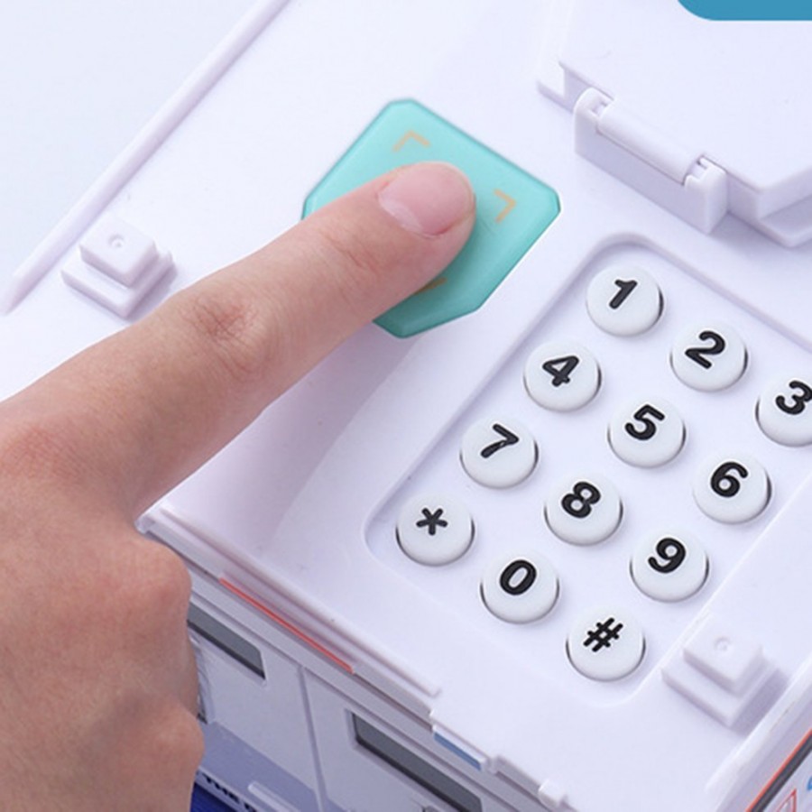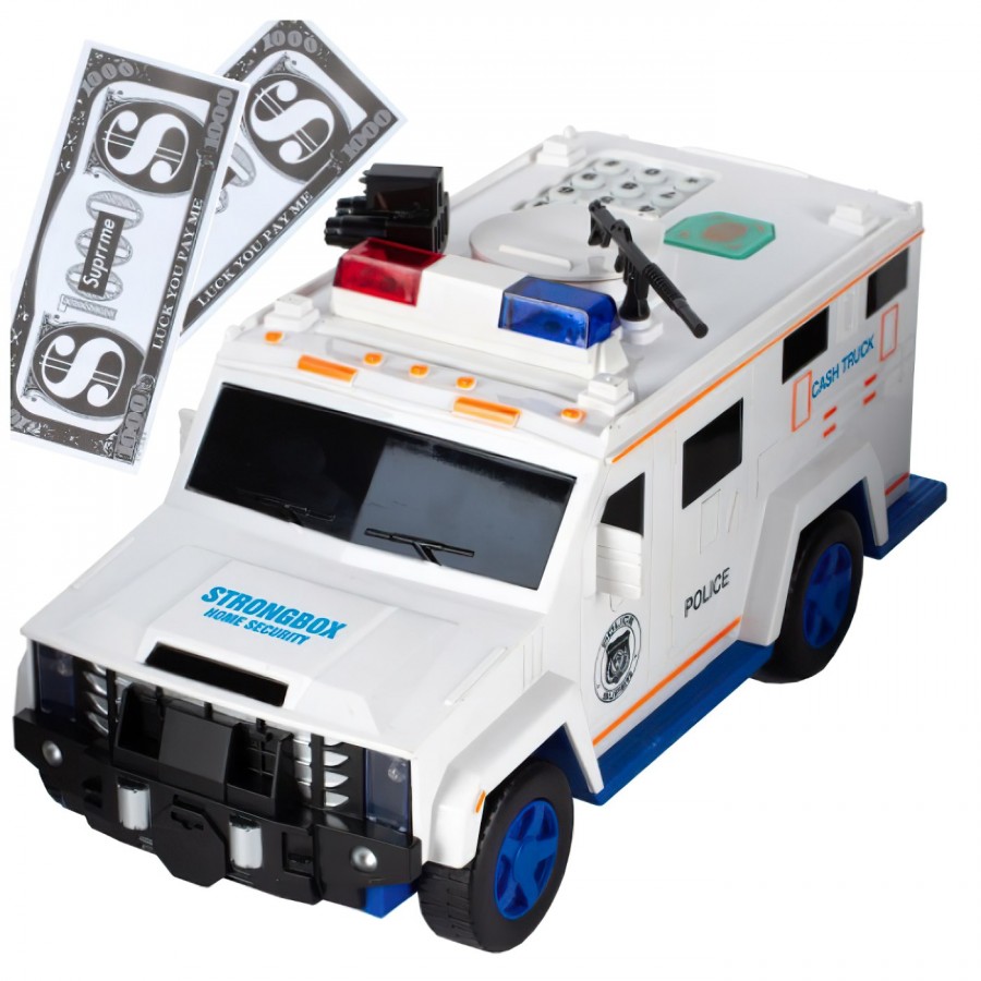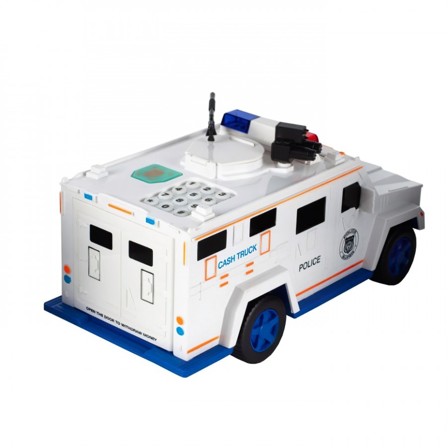 Incurajati copiii sa-si dezvolte obiceiul de a economisi si sa cunoasca valoarea banilor. Aceasta pusculita are forma unei masini blindate de politie, in care toate monedele si bancnotele vor fi protejate prin parola de siguranta (parola implicita 0000).