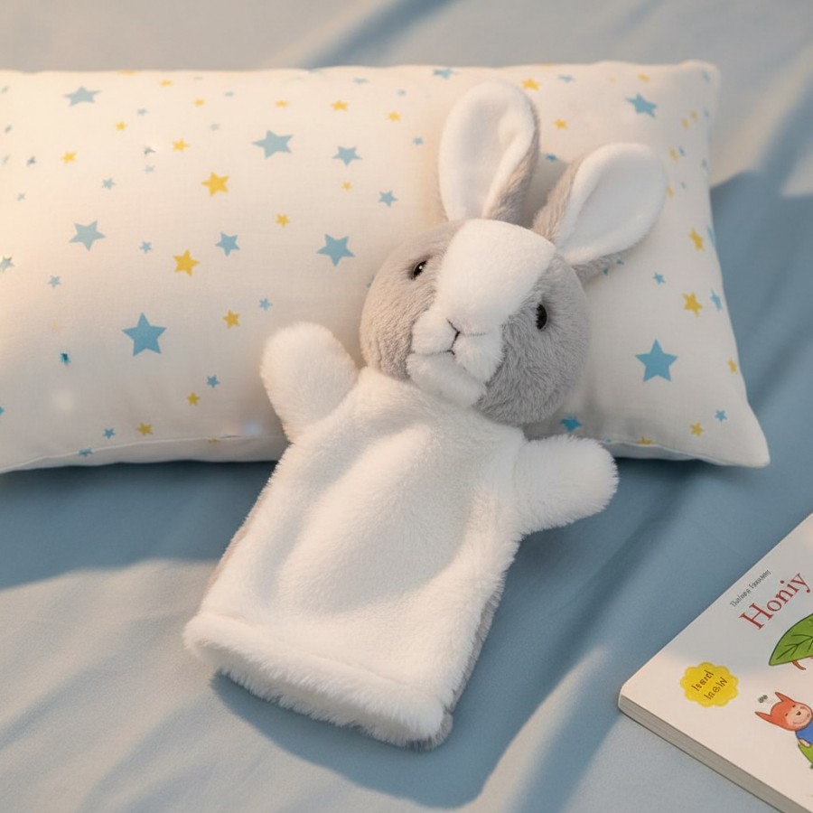 Marioneta din plus, model iepuras, alb/gri, 28 cm