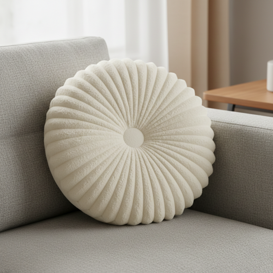 Etichete: Perna decorativa moale si confortabila, model cu nasture, rotunda, Ø35x8 cm, poliester, crem, Plusuri si textile, Lumea Copiilor