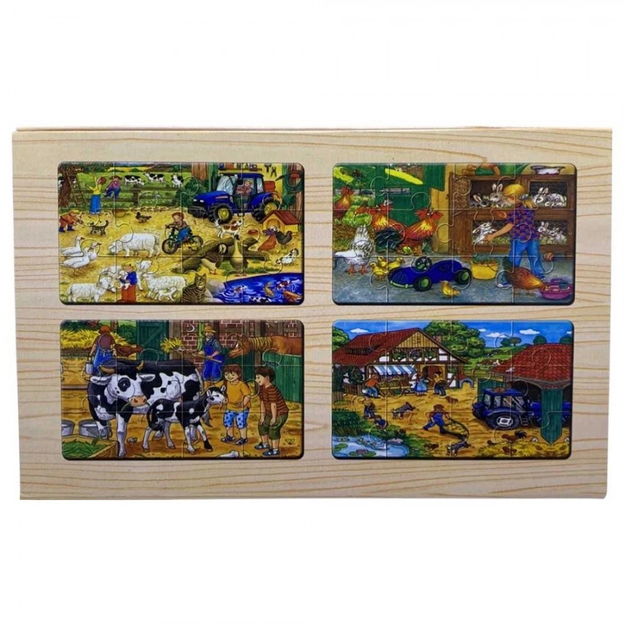 Puzzle din lemn pentru copii – 4 planșe cu animale din ferma x 12 piese, cutie închidere magnetică
