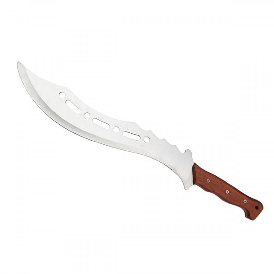 Constructia full tang ofera o durabilitate excelenta, lama fiind realizata dintr-o singura bucata de otel inoxidabil 420, ceea ce asigura stabilitate si rezistenta ridicata in utilizare. Manerul robust este completat cu insertii din lemn, oferind o priza sigura si confortabila in timpul manevrarii.