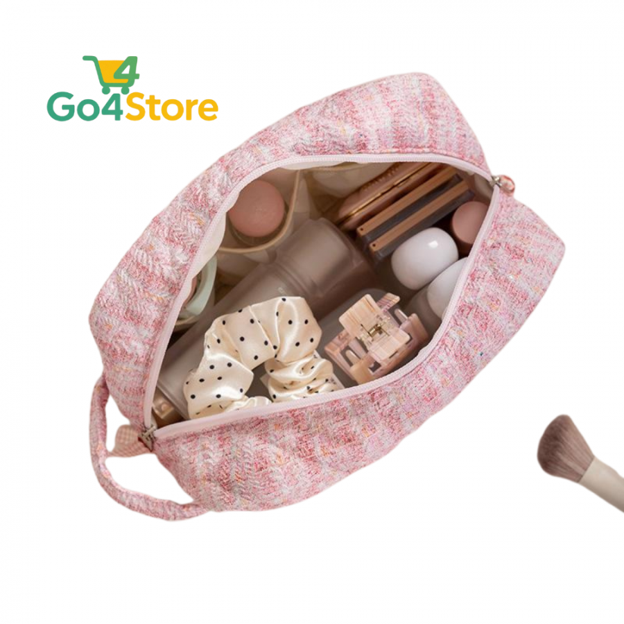 Organizează-ți produsele de înfrumusețare cu stil cu această geantă cosmetică premium, realizată din material textil moale, cu aspect elegant și feminin.