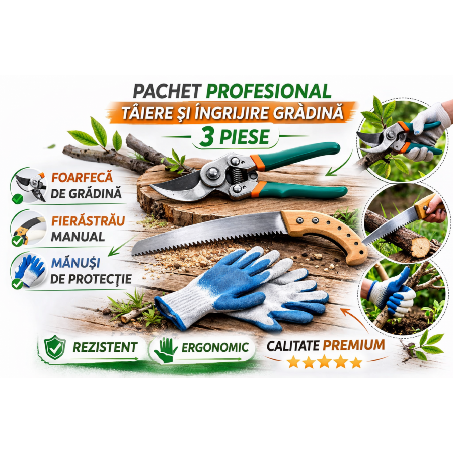 Pachet Profesional Taiere si Ingrijire Gradina – 3 Piese: foarfeca, fierastrau si manusi