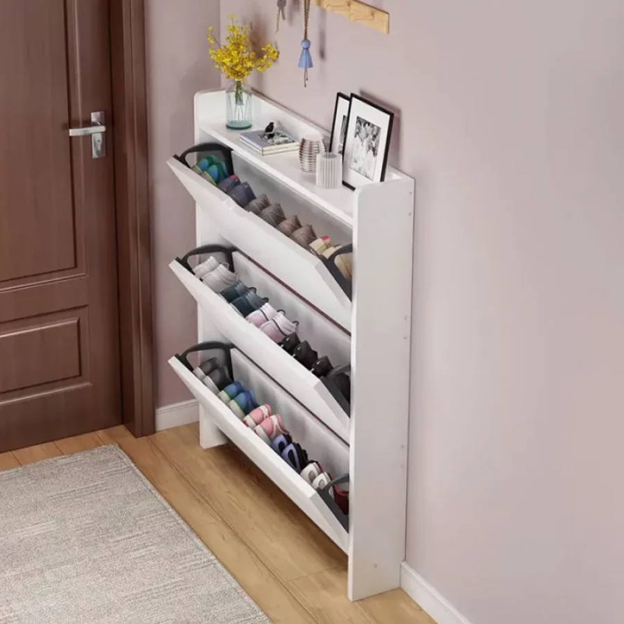 Organizeaza-ti holul cu eleganta folosind acest pantofar alb, o piesa unica de mobilier cu 3 usi swinging care se deschid de sus in jos. Ofera spatiu generos pentru pantofi si accesorii, fiind solutia perfecta pentru un depozitare practica si ordonata.