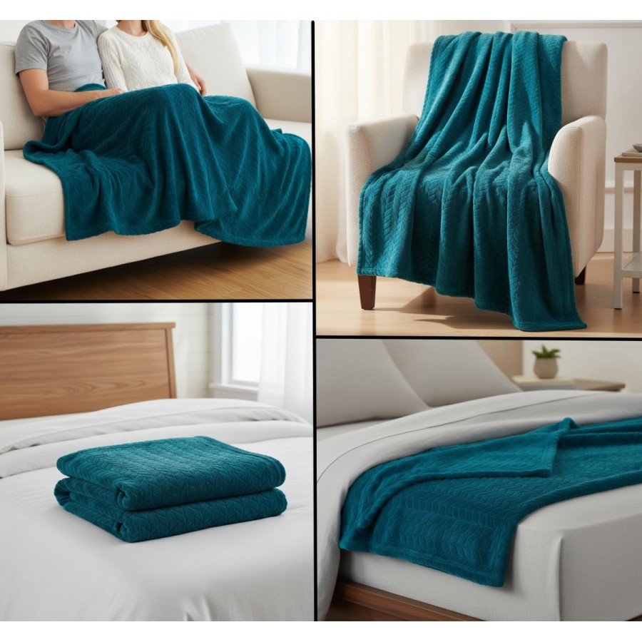 Patura moale si catifelata, tip cuvertura, turcoaz, 160x130 cm, model reliefat, confortabila