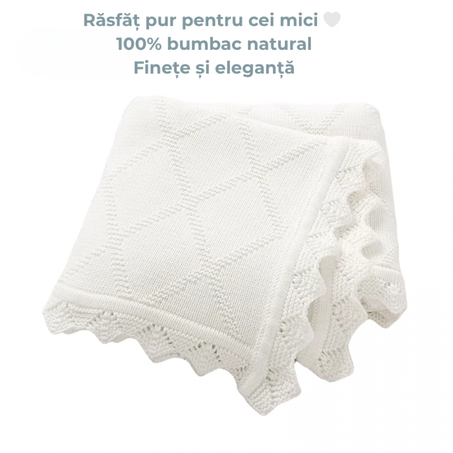Alege o păturică pentru bebeluși din 100% bumbac moale, perfectă pentru pielea sensibilă a nou-născuților. Cu dimensiunea ideală de 70x90 cm, este potrivită pentru pătuț, cărucior sau momentele de somn și relaxare.