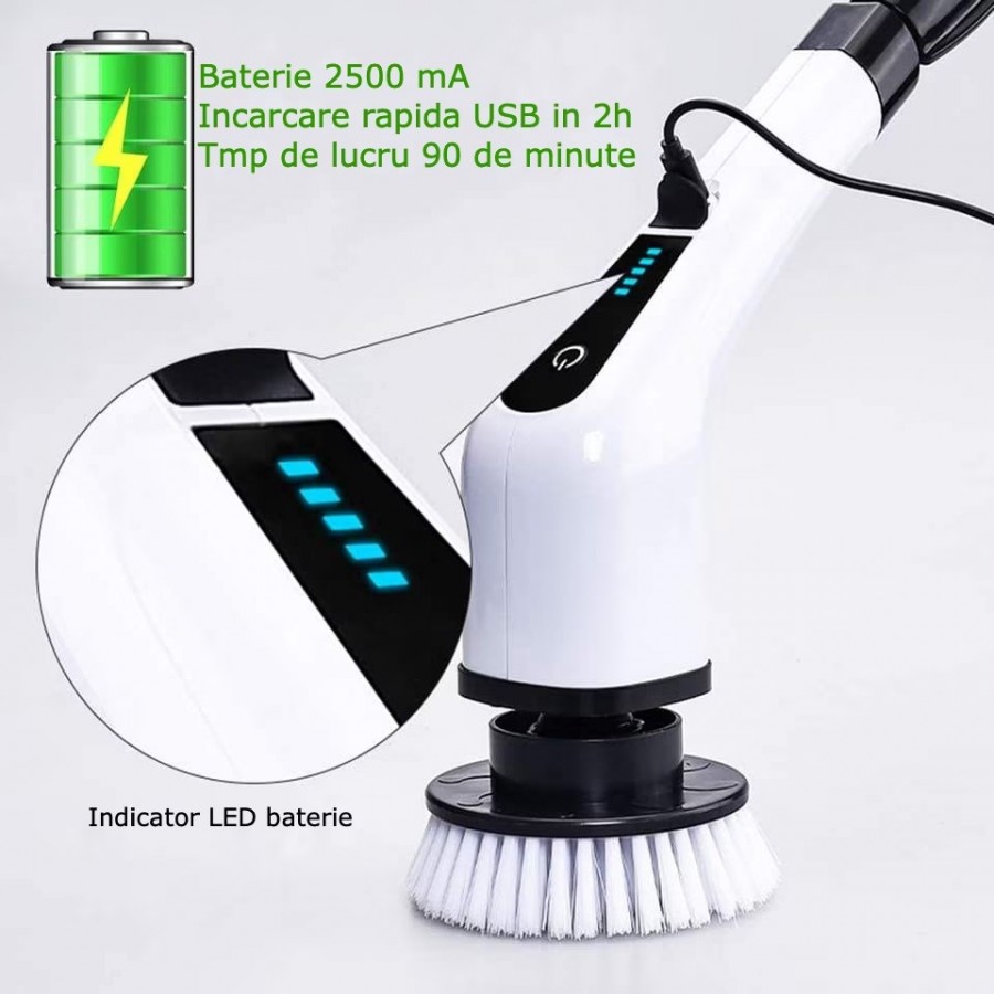 Aceasta perie electrica rotativa este ideala pentru curatarea eficienta a suprafetelor din baie si bucatarie, inclusiv gresie, faianta si rosturi. Datorita capetelor interschimbabile, poate fi folosita ca o perie electrica universala pentru diverse suprafete, fiind potrivita atat pentru curatarea zilnica, cat si pentru murdarie persistenta. Designul telescopic permite accesul facil in zone greu accesibile.