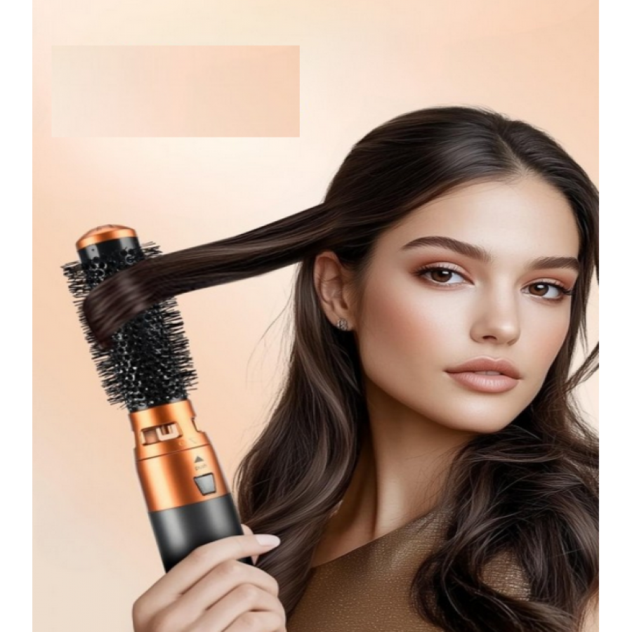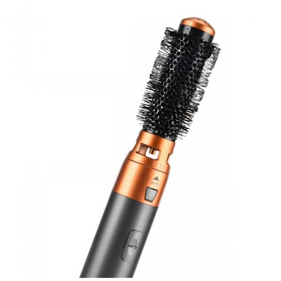 Perie electrică rotativă pentru coafat, cu un design modern în nuanțe de negru și cupru.