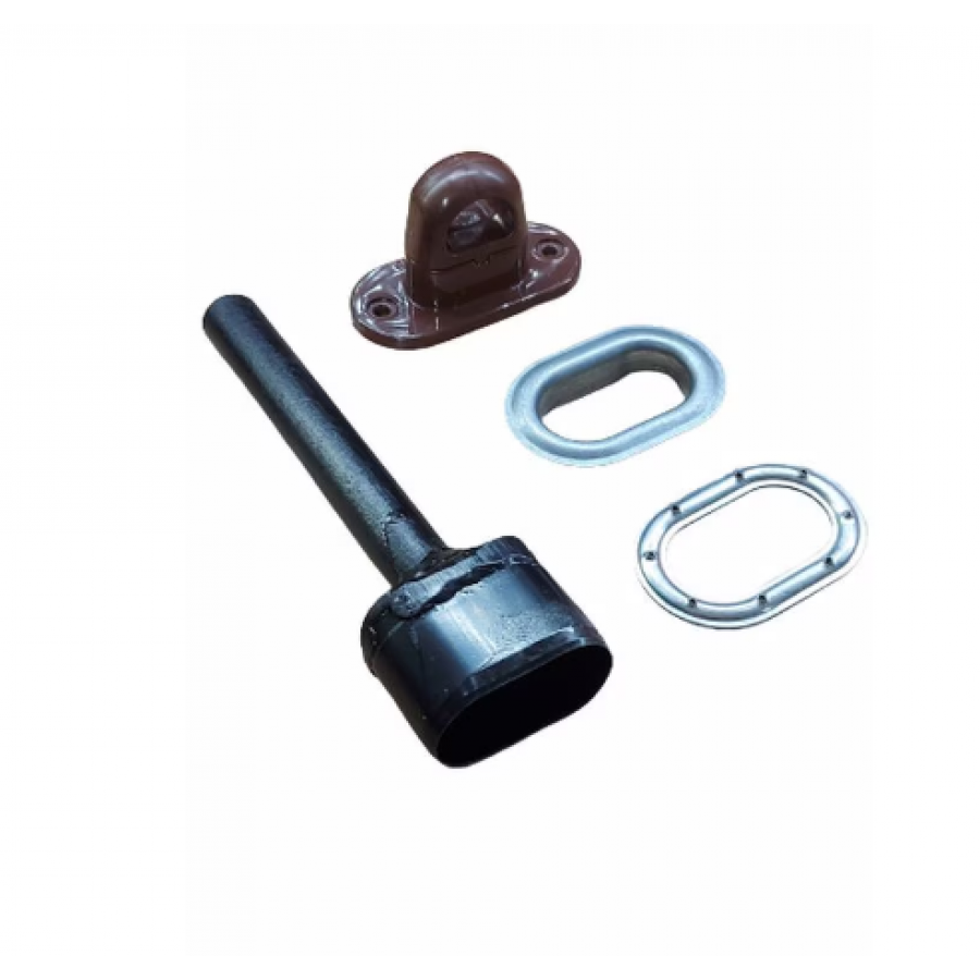 Unealta din metal tip Preducea cu maner si gaura evacuare, fabricata in Romania, folosita pentru decupare folie transparenta, banda de intarire, prelate, materiale textile , s.a pe care urmeaza a fi montate capse ovale 42 mm x 22 mm.