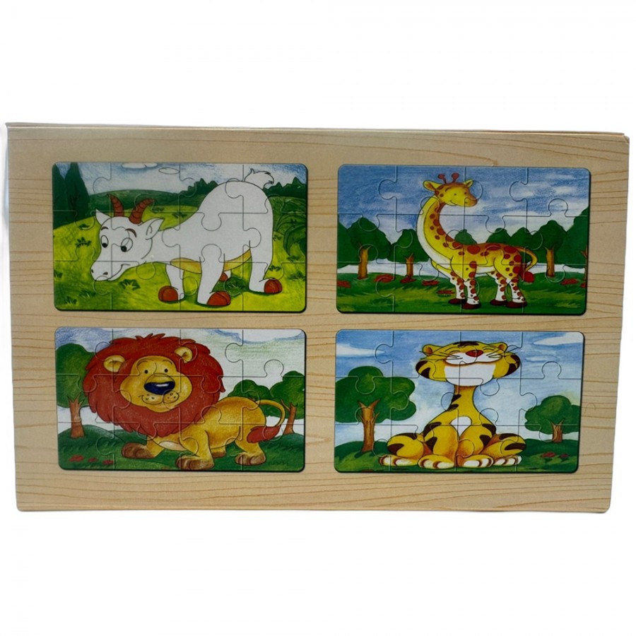 Descoperă un set educativ și distractiv de puzzle-uri din lemn, perfect pentru dezvoltarea celor mici! Setul conține 4 planșe ilustrate cu animale (girafă, leu, tigru și capră), fiecare formată din 12 piese mari, ușor de asamblat.