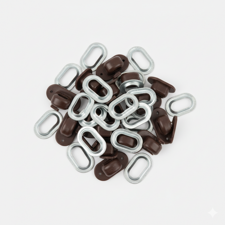 - 10 x Bride de Prindere: Aceste bride sunt solutia perfecta pentru a completa sistemul de inchidere. Proiectate pentru a interactiona perfect cu capsele ovale, ele ofera o metoda sigura si rapida de a tensiona si fixa materialele. Constructia lor solida asigura o prindere ferma si o rezistenta crescuta la vant si alte solicitari.