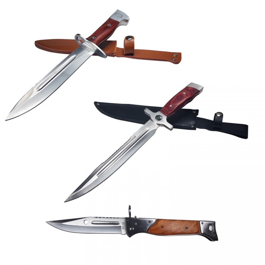 Set 3 briceaguri de vanatoare Ak System, otel inoxidabil, maro, teaca inclusa