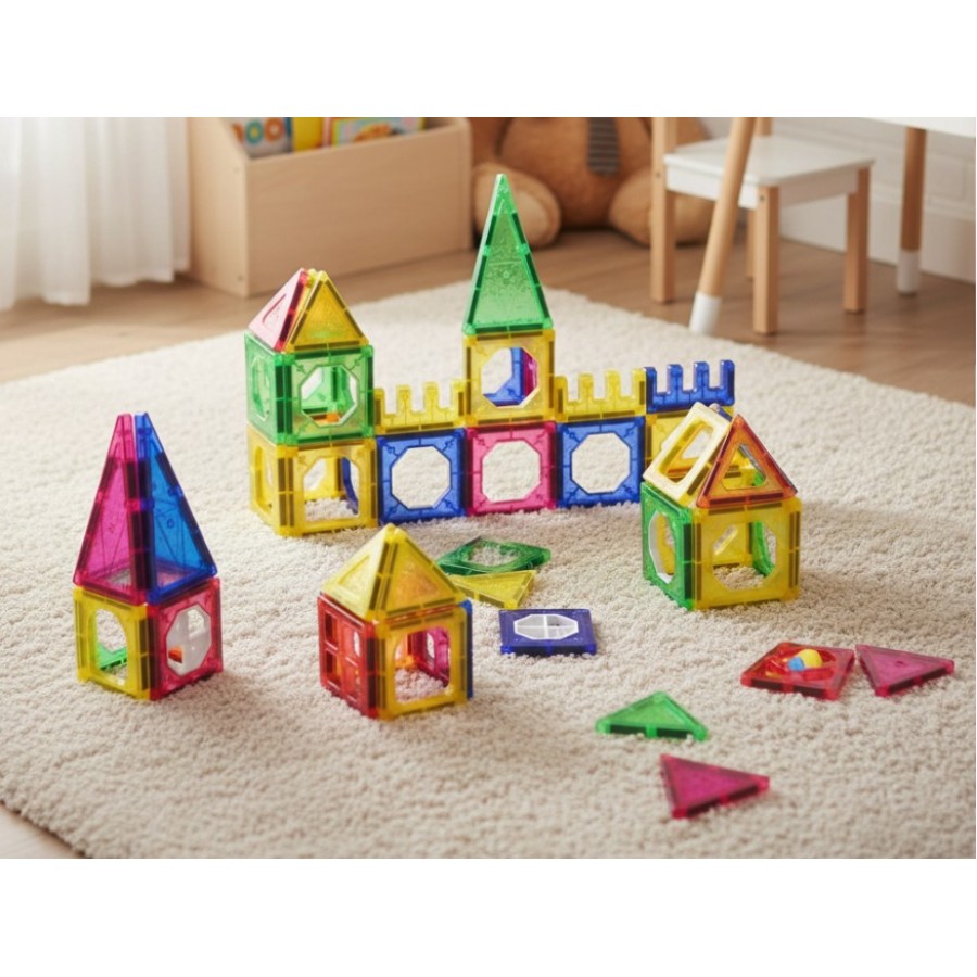 Acest set de 34 piese magnetice de construit este ideal pentru dezvoltarea creativitatii si a gandirii logice la copii. Piesele se imbina usor datorita magnetilor integrati, permitand realizarea diferitelor constructii stabile si variate. Setul incurajeaza jocul educativ, coordonarea mana-ochi si imaginatia, fiind potrivit pentru copiii cu varsta de peste 3 ani.