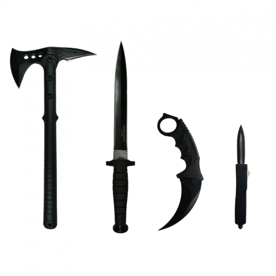 Set 4 accesorii vanatoare topor si 3 cutite, otel inoxidabil, negru