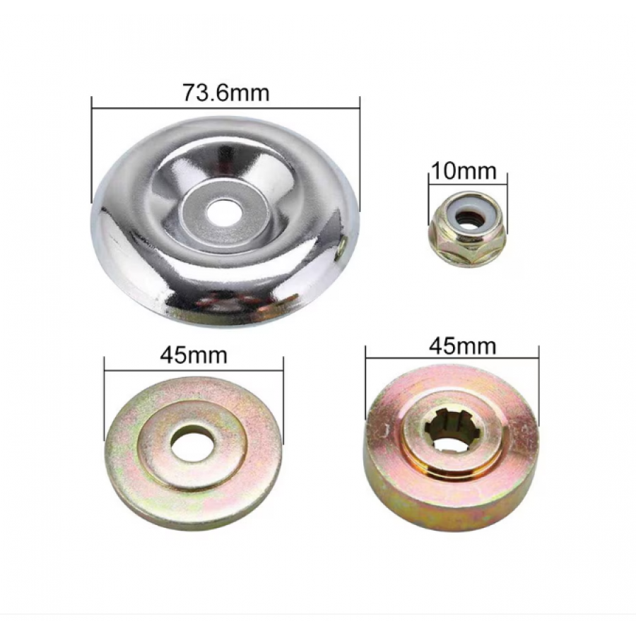 2. Garniturile superioare si inferioare, capacul de protectie si trusa de fixare a piulitelor anti-filet se potrivesc cu majoritatea masinilor de tuns iarba. Utilizati acest kit de fixare pentru a fixa lama masinii de tuns iarba pe capul rotativ, care este usor de operat.