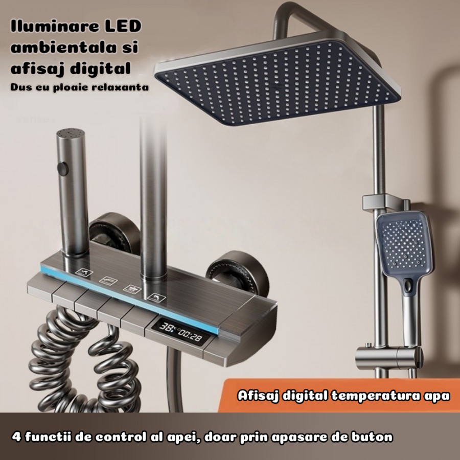 Etichete: Set Coloana Dus Digital, Termostat, LED, Afisaj Temperatura, 4 Functii, Tip Ploaie, Grafit, Unibox, Sanitare si accesorii, Articole pentru casa