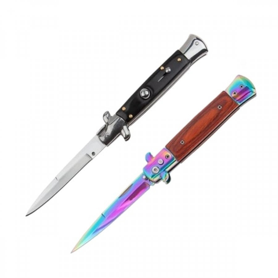 Briceag pliabil cu arc, cu finisaj decorativ în culori curcubeu, având lamă cu profil tip vârf de suliță din oțel inoxidabil 420, rezistent la coroziune și uzură. Mânerul din metal cu inserții din lemn asigură stabilitate și confort. Deschiderea este rapidă, prin buton, iar sistemul de blocare prin buton oferă siguranță în utilizare și transport.