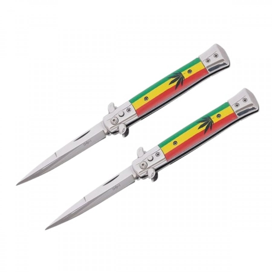 Set format din două cuțite pliabile cu arc, inspirate de stilul clasic sicilian, cu un design distinctiv decorat în culori Rasta. Lamele retractabile au profil tip vârf de suliță și sunt realizate din oțel inoxidabil 420, oferind rezistență bună la coroziune, durabilitate și întreținere ușoară.