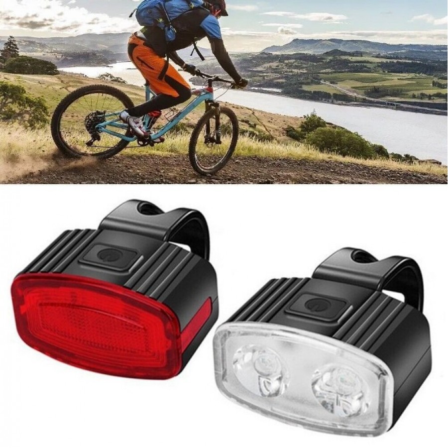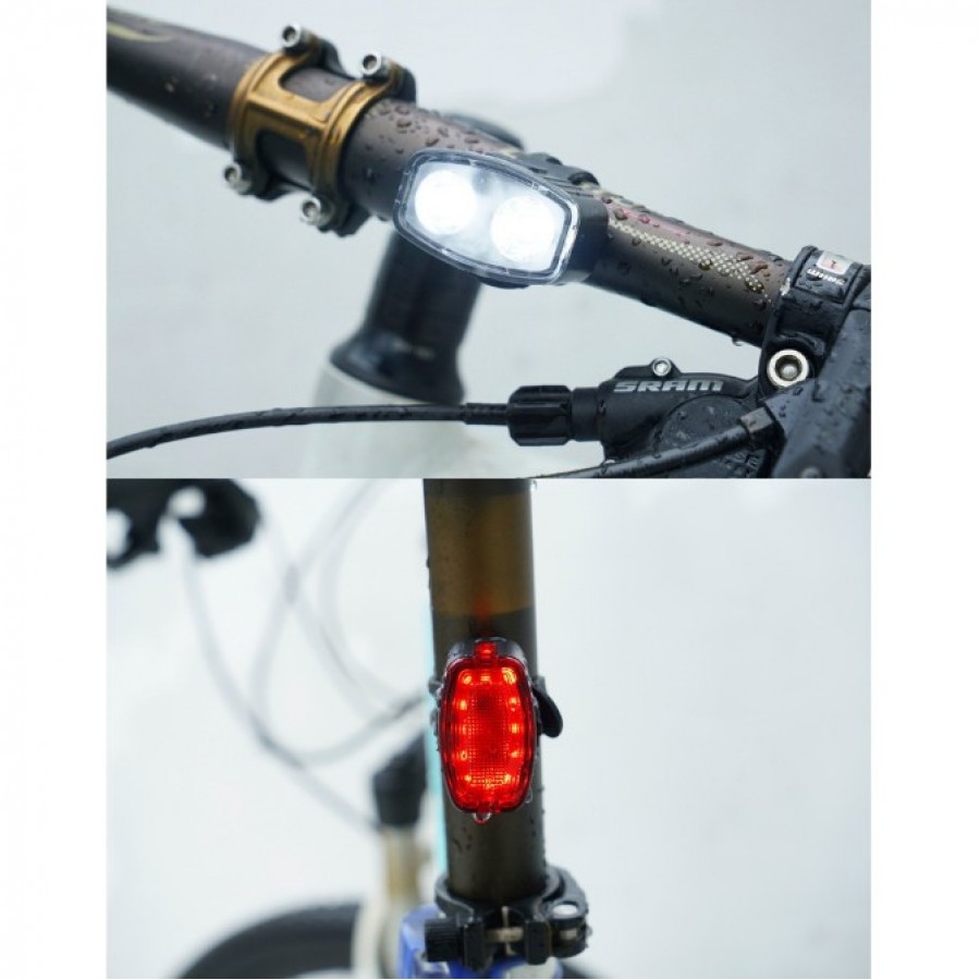 Realizat din material plastic rezistent, cu finisaj alb pentru far si rosu pentru stop, design compact si usor, acest set este reincarcabil prin cablu USB (inclus), rezistent la apa (nivel IPX5) cu port protejat, perfect pentru ploaie, stropi sau umezeala. Montarea este simpla si sigura prin curea de cauciuc cu dinti multipli, fixare pe ghidon fata, tija sa, cadru sau alte parti, asigurand stabilitate chiar si pe drumuri solicitante. Autonomie de 3-12 ore in functie de mod.