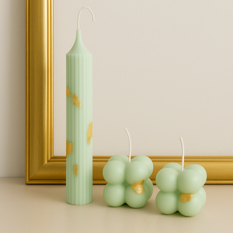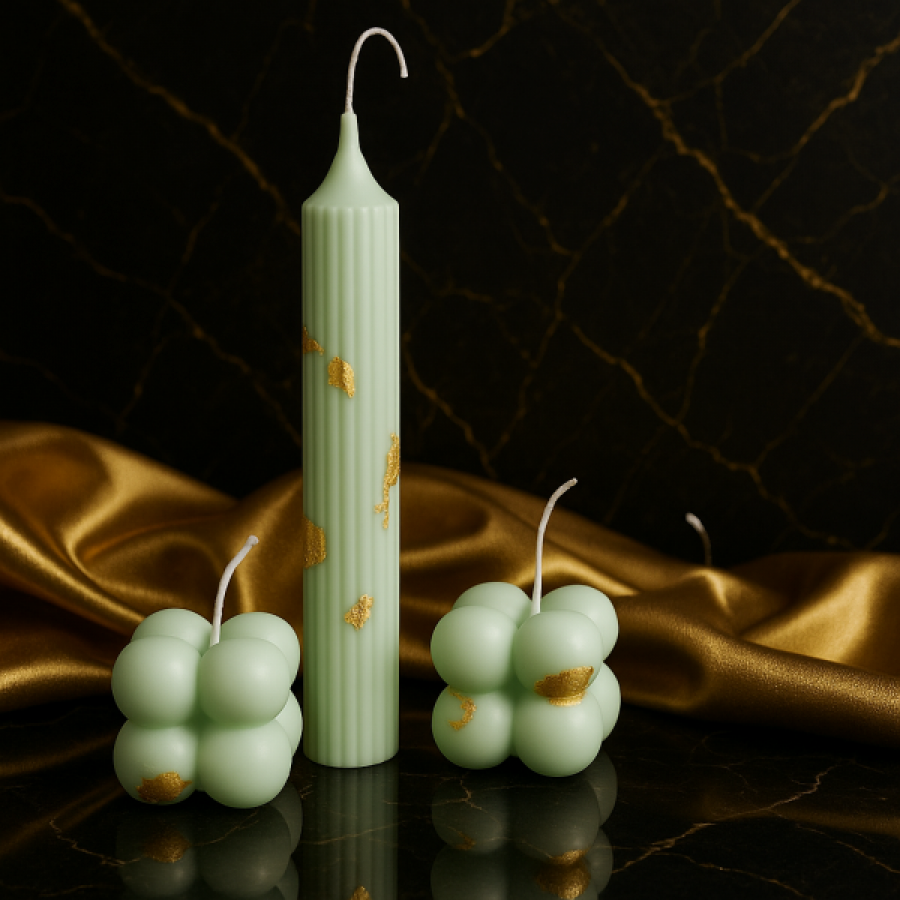 – 2 lumânări bubble în nuanță olive satinat, cu accente de foiță de aur