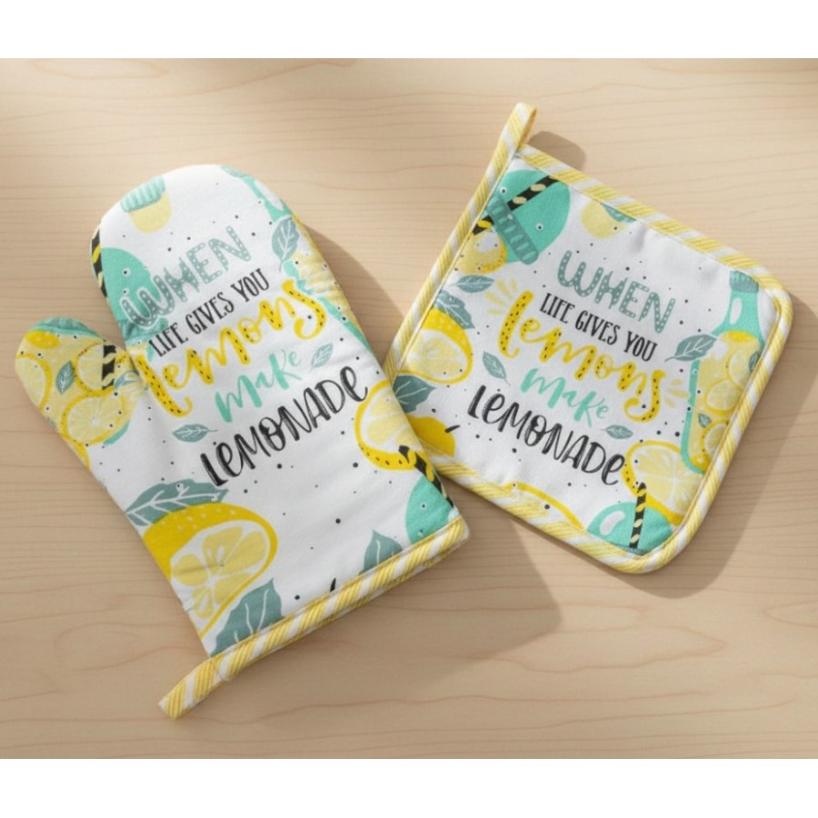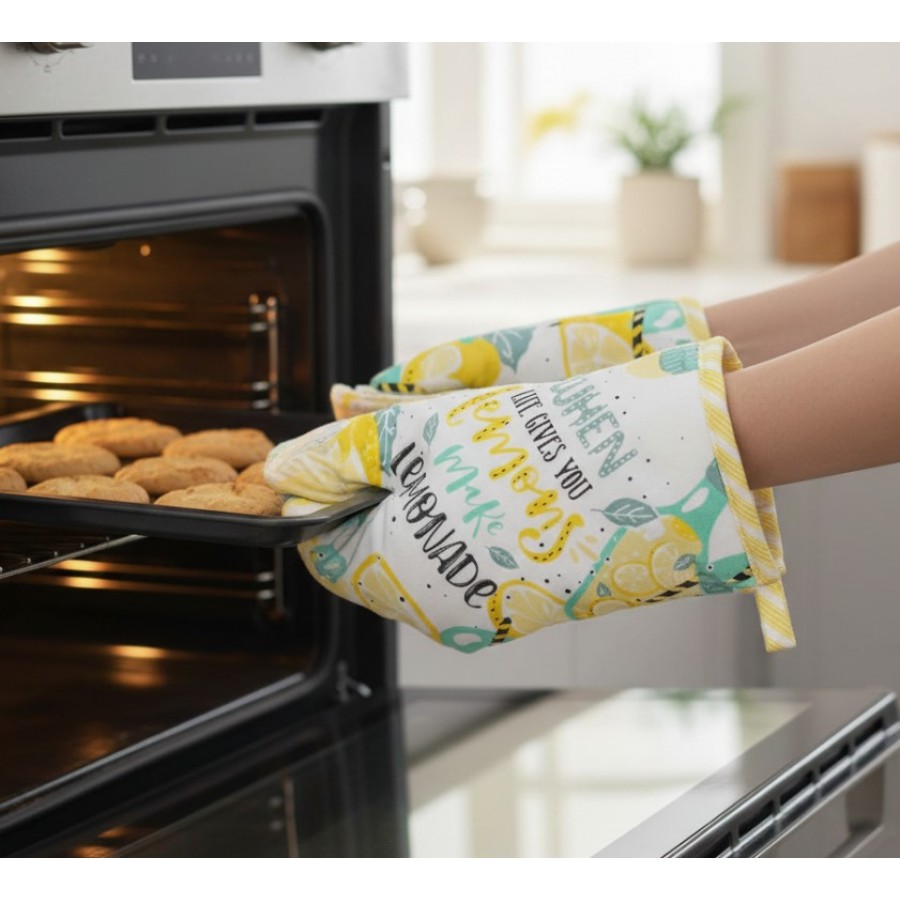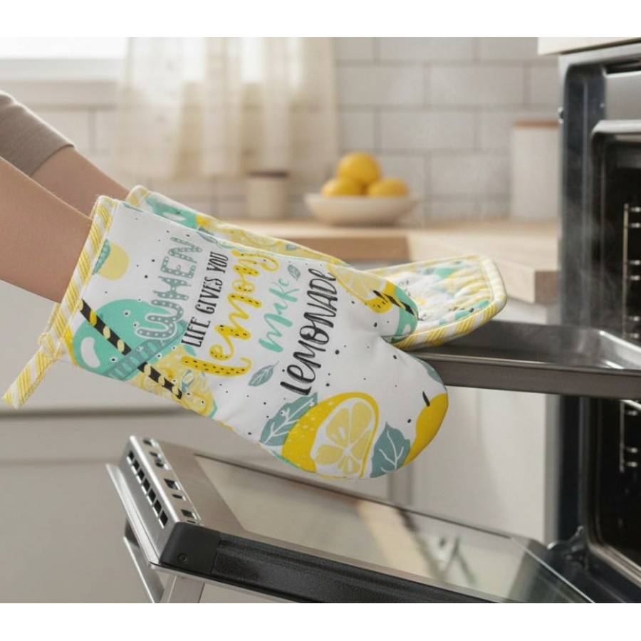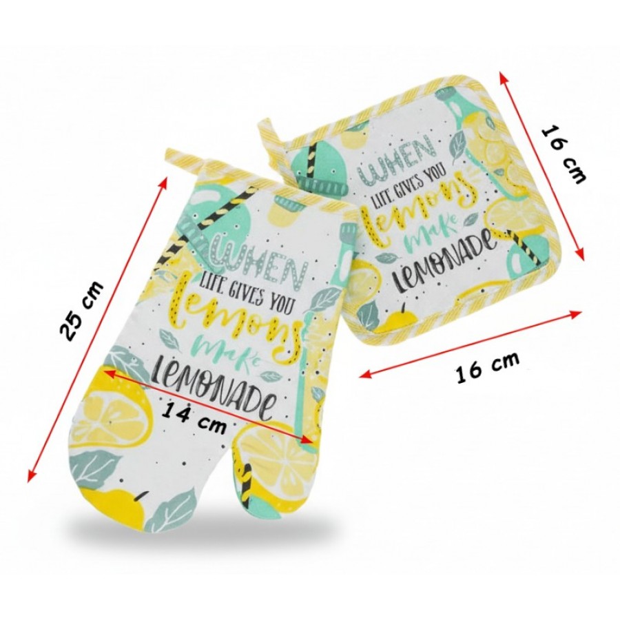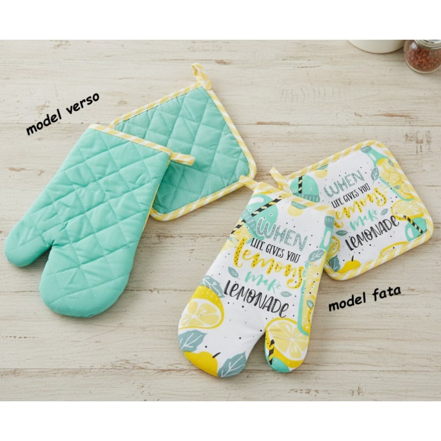 Set practic si util pentru activitatile zilnice din bucatarie. Realizate din amestec de bumbac si poliester, accesoriile ofera rezistenta si confort in utilizare.