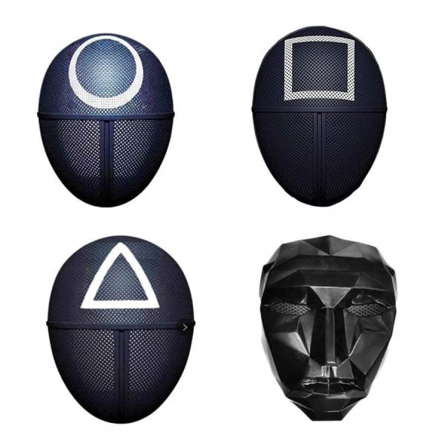 Etichete: Set patru masti pentru carnaval, Squid Game, Triunghi, Patrat, Cerc, Negru, Lider